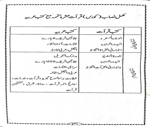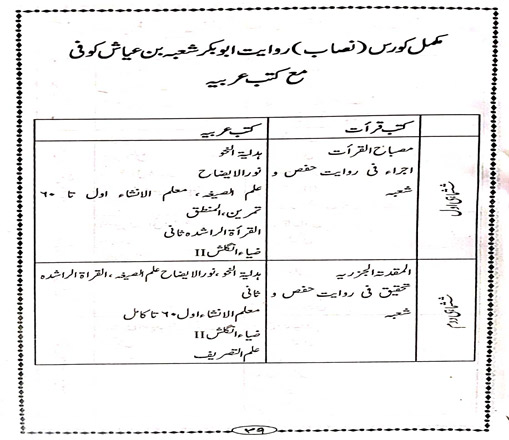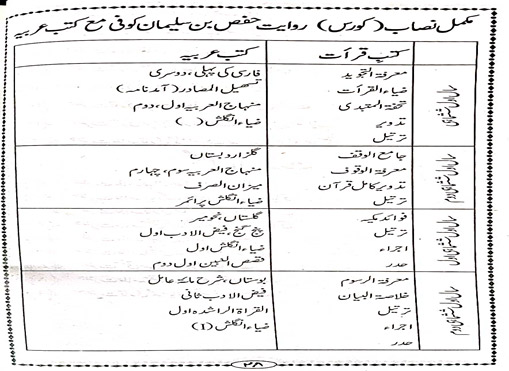 The above-mentioned stages have the many subjects but theological subjects become deep-rooted among the students and they become no less familiar with the modern branches of knowledge to keep pace with the time. During the above- mentioned stages special emphasis is made on the education of Tafseer, Hadith, Islamic Jurisprudence, Law of Inheritance, Islamic ideology, Arabic literature, Rhetoric, Logic and Philosophy, Islamic History, Geography, Worlds Religiouns, Economics, Political Science, English literature, Memorising and recitation of the Quran and Education.