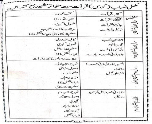 The above-mentioned stages have the many subjects but theological subjects become deep-rooted among the students and they become no less familiar with the modern branches of knowledge to keep pace with the time. During the above- mentioned stages special emphasis is made on the education of Tafseer, Hadith, Islamic Jurisprudence, Law of Inheritance, Islamic ideology, Arabic literature, Rhetoric, Logic and Philosophy, Islamic History, Geography, Worlds Religiouns, Economics, Political Science, English literature, Memorising and recitation of the Quran and Education.